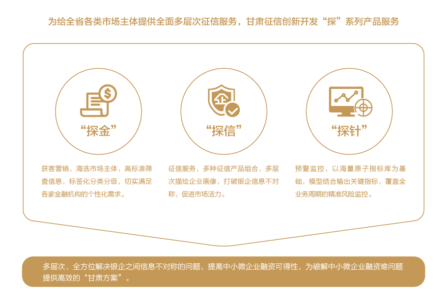 甘肅征信建立以征信數(shù)據(jù)庫、數(shù)據(jù)處理系統(tǒng)、征信智能應(yīng)用系統(tǒng)為核心的企業(yè)征信服務(wù)平臺(tái),為客戶提供征信報(bào)告、信息核驗(yàn)、信用評(píng)分、智能風(fēng)控分析決策等綜合信用服務(wù),實(shí)現(xiàn)在線經(jīng)濟(jì)金融、社會(huì)管理、公共服務(wù)等多領(lǐng)域的廣泛應(yīng)用。